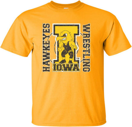 The perfect shirt to Cheer on our Iowa Hawkeye Wrestlers at Carver-Hawkeye Arena! This design features the Wrestling Herky on a big "I" and a wrestling circle. The design also says Iowa Hawkeyes Wrestling. Printed on a pre-shrunk, 100% cotton gold t-shirt with white, gold and black ink. All of our Iowa Hawkeye designs are Officially Licensed and approved by the University of Iowa.